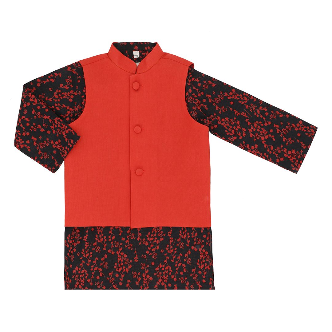 ORANGE RUST WAISTCOAT IN IRISH LINEN AND BLACK-RUST PRINT KURTA